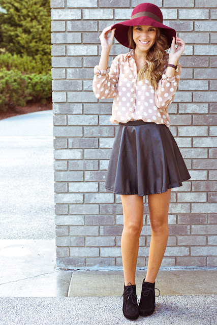 I love prints for spring. The easiest way to get on the print wagon? Polka dots! This top from August Wrinkle (which also comes in mint...adorable!), is the perfect mix of sheer and polkadots. I feel like this piece will be so easy to transition throughout the seasons as its light and airy but easily layer-able. Perfection. I've been rocking my vegan leather skirt quite often lately and really loved how the polka dot top helped to tone down toughness and bring out a more playful side. With my favorite DV by Dolce Vita wedges and my new FAVORITE hat (seriously, I've never been a hat girl, but I never want to take this one off!!), I felt this was an outfit worthy of a revamped blog :)