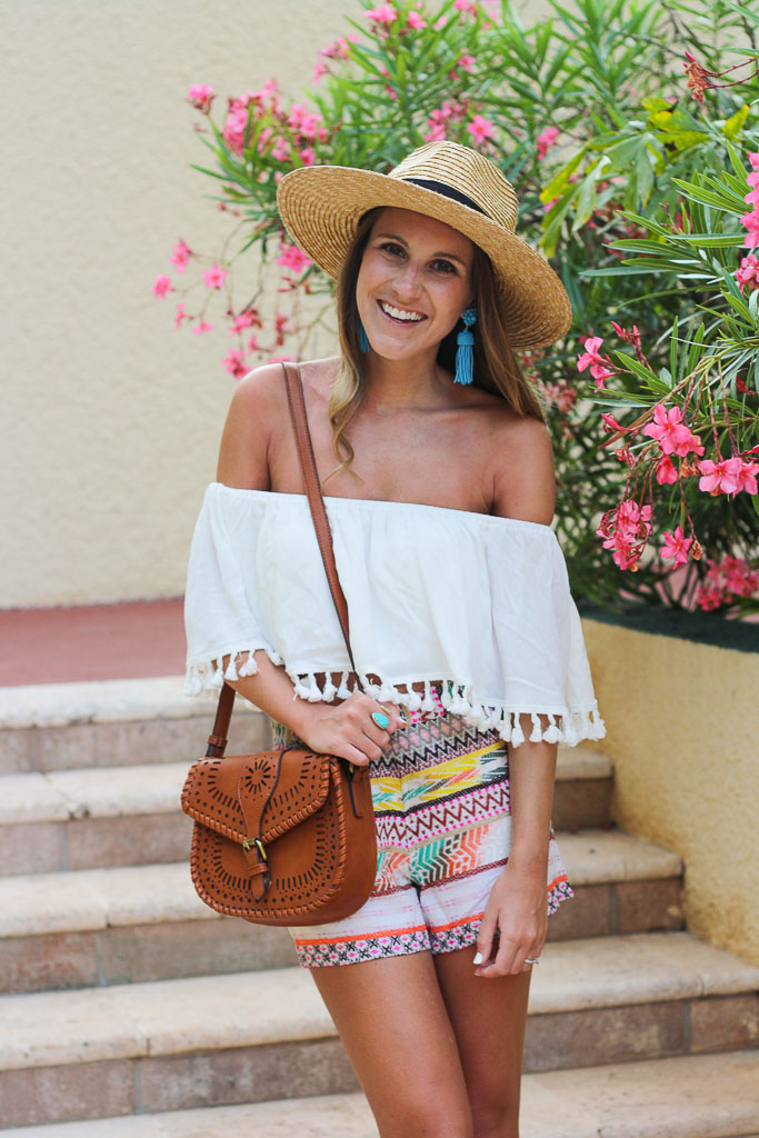 Sharing another outfit from Mexico today! After spending all day on the beach, we would usually head back to our room and get ready for a night out on the town. The humidity made getting dressed easy. There was no need to worry about layering or bringing a jacket, and that's saying a lot because I am ALWAYS cold! This outfit was one of my favorites, and is SO easy to re-create! A white off the shoulder top paired with printed shorts is a fun summer look for a festival, the beach or even a night out!