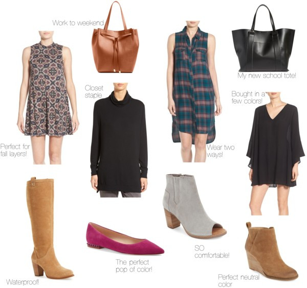 I love dresses because they are so easy to wear! I picked up multiple options because they are so easy to layer with leggings and sweaters in the frigid winter months! I bought a few different pairs of shoes, including some waterproof boots that are cute AND practical. Last but not least, a good school tote is a must. I lug a lot of papers and my work computer from home to school and need a sturdy, roomy bag that is also cute so I can take it from work to date night!